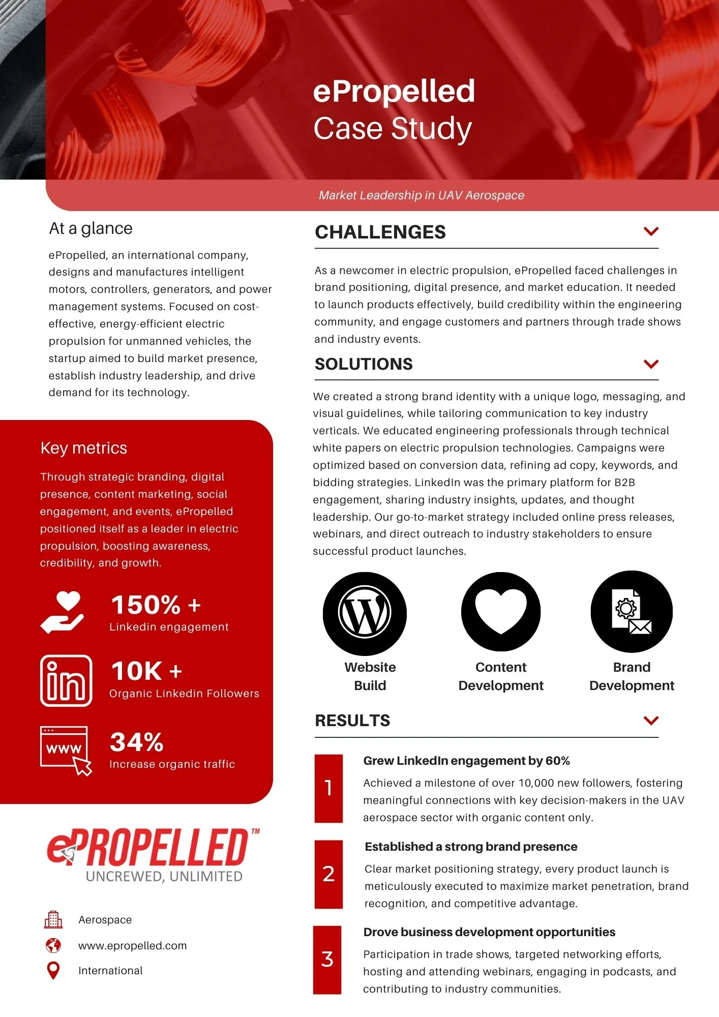 ePropelled utilized an innovative marketing strategy to position itself as a leader in electric propulsion technology. They focused on thought leadership through whitepapers, webinars, and industry event participation, highlighting their advanced energy-efficient solutions.