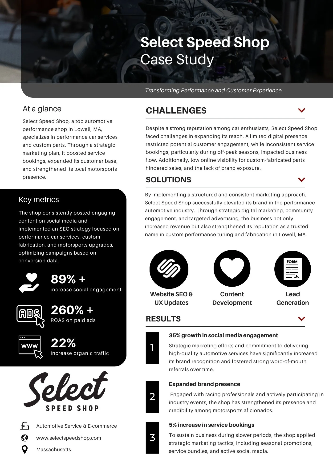 Select Speed Shop adopted a dynamic marketing strategy focused on client acquisition and content development to grow its brand. They leveraged high-quality video content, behind-the-scenes builds, and customer testimonials to showcase their expertise and engage car enthusiasts.